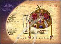 皇冠及系列事物名称,背景为匈牙利版图(皇冠为金箔立体压印)小型张