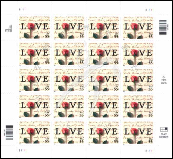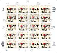 情人节,“玫瑰和情书”不干胶自贴票55c小版张(20票)