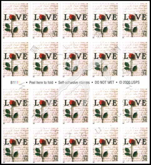 情人节,“玫瑰和情书”不干胶自贴票34c小版张(20票)
