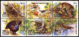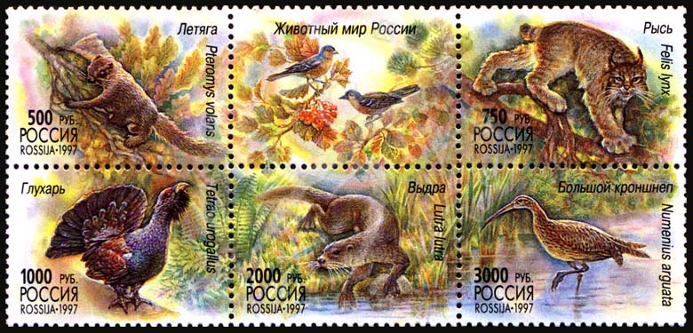 野生动物,飞鼠、山猫、松鸡、水獭及白腰杓鹬等5联+1枚附票