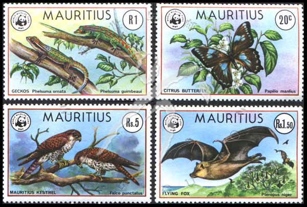 邮票介绍:野生动物蝴蝶、壁虎、狐蝠、毛里求斯鹰等,WWF野生动物基金会徽志4全
