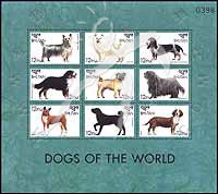 名犬,澳洲丝毛梗犬、萨摩耶、加斯科尼蓝色矮腿猎犬、伯恩山犬、巴哥犬、贝加马斯卡犬、贝生吉犬、荷兰水猎犬及瑞典腊肠犬小版张(9票)