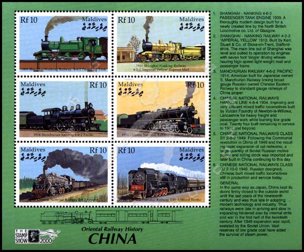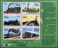 东方铁路发展史伦敦世界邮展加盖,中国铁路和火车,上海-南京铁路、中国国家铁路、快件邮车、东北铁路及火车等小版张(6票)