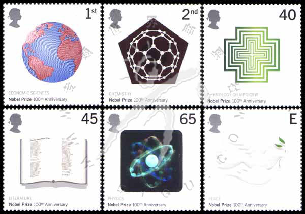 诺贝尔奖百年交互式邮票,经济学奖(地球)、化学奖(变色票)、和平奖(鸽)、生理医学奖(香味票)、文学奖、物理学奖(全息图)6全(我社已售缺)
