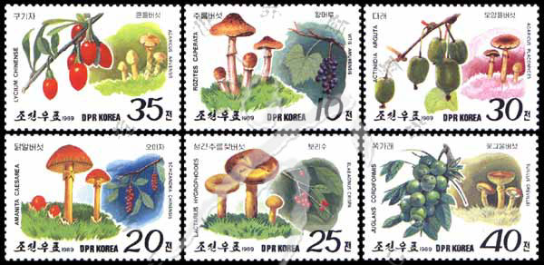蘑菇及野果,皱盖罗鳞伞及山葡萄、橙盖鹅膏菌及北五味子、双环林地蘑菇及软枣猕猴桃、野蘑菇及枸杞、厚环粘盖牛肝菌及心形核桃等6全