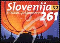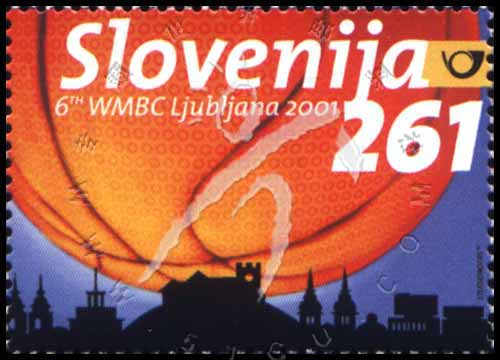 邮票介绍:第6届世界大龄篮球锦标赛,承办城市卢布尔雅那夜景及金黄色的篮球1全