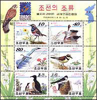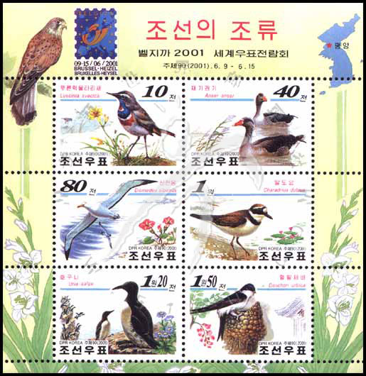 鸟类,蓝点颏、灰雁、信天翁、金眶珩、厚嘴海鸦等小全张(6票,边纸上有地图、2001年比利时邮展加盖)