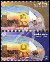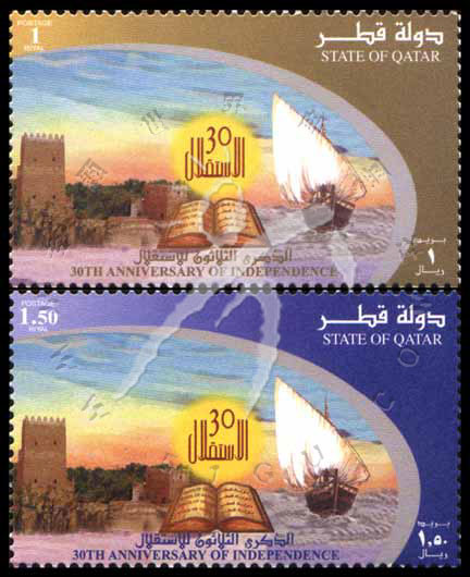 独立30周年,波斯湾上波浪前进的阿拉伯帆船(国徽变体)、书籍和城堡2全