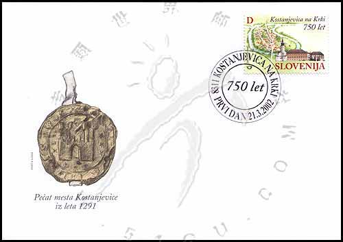斯洛文尼亚最小和最古老的小镇—Krka河上Kostanjevice镇建镇750周年,被Krka河环绕的小镇俯瞰图及镇上的艺术馆1全邮票首日封