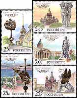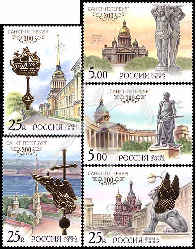圣彼得堡建城300周年,圣彼得、圣保罗大教堂、海军部、复活教堂、雕塑、耶稣及十字架等凹凸压印5全(其中3枚为烫金邮票,含1枚黄金鉴书)