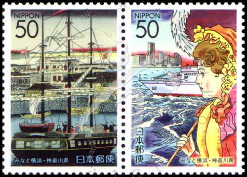 故乡邮票—神奈川县的横滨港 ,歌川广重的浮世绘画《横滨海岸景色》及尾崎真吾的绘画、帆船、大楼及少女2联