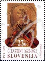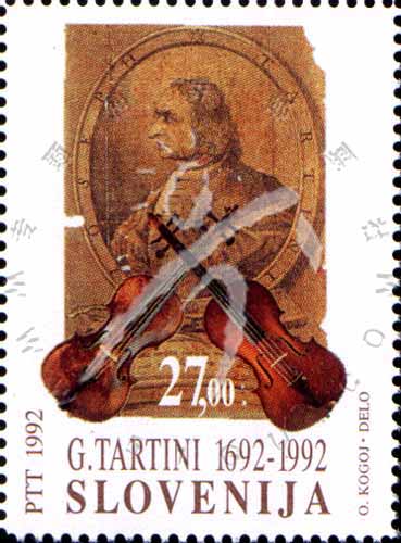 意大利著名小提琴演奏家和作曲家泰天尼(G.Tartini,1692-1770)诞辰300周年,镜框中的肖像和交叉的小提琴1全
