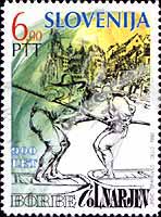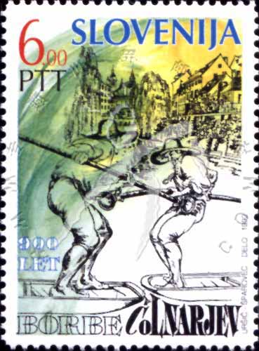 首都卢布尔雅那河的船夫技艺比赛900周年,在船头切磋技艺的船夫及河流沿岸风景等绘画1全