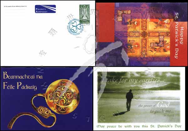 爱尔兰传统节日和国庆日—圣帕特里克节,爱尔兰守护神圣帕特里克、三叶草、节日贺卡等加绿色三叶草戳邮资封(3枚邮资封+3张贺卡)
