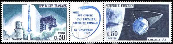 法国第一颗卫星发射成功,钻石号火箭及A-1号卫星雕刻版2联(带过桥为卫星发射日期)