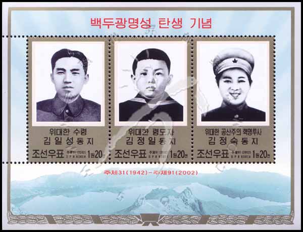 伟大领袖金正日同志华诞,金日成、金正日、金正淑三大将军肖像及白头山等小全张(3票)