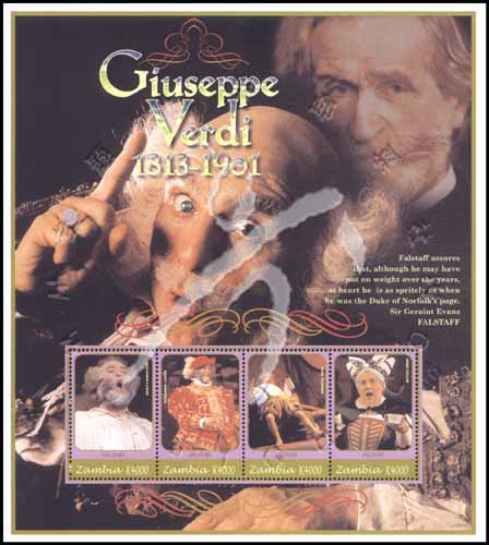 意大利歌剧作曲家威尔第逝世100周年,肖像和作品《福斯塔夫》剧景和角色小全张(4票)
