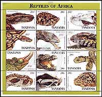 非洲爬行类动物,非洲蟒蛇、南非绞龟、加蓬咝蝰、西非巨蜥、三角避役、伍基树蝰及犀咝蝰等小版张(12票)