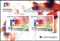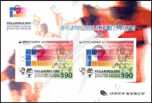 韩国2002世界邮展,徽志及民俗舞蹈无齿小全张(2票)