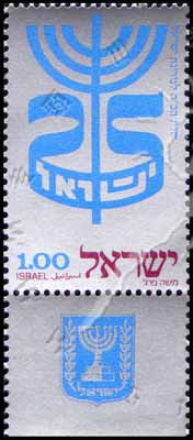 以色列独立25周年,犹太教的七枝大烛台及数字25等1全(带边纸为以色列国徽)