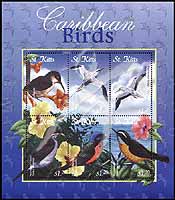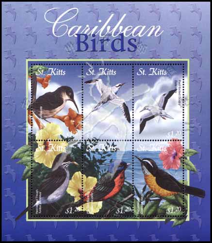 鸟类,红脚鲣鸟、白尾热带鸟、摇尾鸟、红腿画眉、白颊鸟、花卉等小全张(6票)