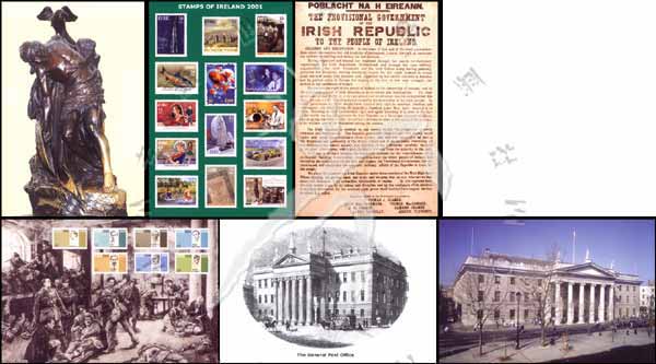 爱尔兰邮政总局的发展历史,位于都柏林欧康奈特街的邮政总局、爱尔兰共和国临时政府宣言、2001年爱尔兰发行的邮票等邮资片6全