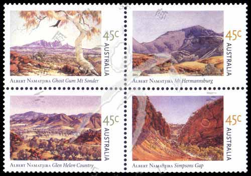 澳土著画家阿尔伯特·纳玛其拉诞生百年,绘画《桑德山的橡胶树》、《赫尔曼斯伯格山》、《格林-海勒恩郡》及《辛普森峡谷》4联
