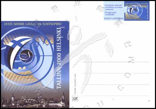 爱沙尼亚-芬兰歌舞节,徽志及城市俯瞰图国际通用邮资片1全
