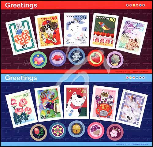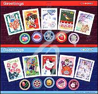 祝福邮票,雪人、龟鹤、婚礼、樱花、红心等2枚不干胶小版张(各5票,版张下附有圆形祝福贴纸)(我社已售缺)