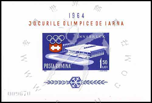 Sc#1597SS 因斯布鲁克第9届冬奥会徽及体育馆无齿小型张1.5I