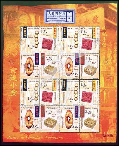 美食与甜品二—街边小食,鱼蛋、牛肉干、萨其玛等(采用法国以柯式平版加热熔技术印刷,效果逼真)小版张(4套共16票)
