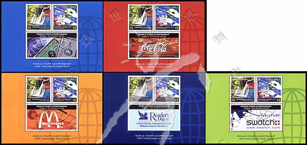 国际化的城市—新加坡城,各种商标(美国麦当劳、可口可乐、读者文摘、运通公司和瑞士斯沃奇腕表)小全张5全