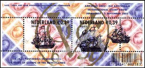 荷兰邮票发行150周年暨2002年荷兰国际邮展,早期邮票票中票及邮运帆船等小全张(2票)