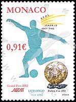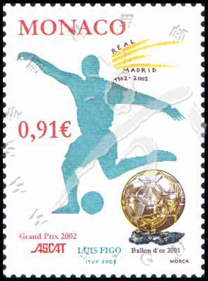 第五次ASCAT集邮大奖获得者—欧洲足球先生菲戈(皇家马德里足球俱乐部队员),徽志、菲戈射门剪影及金色足球雕塑等雕刻版1全