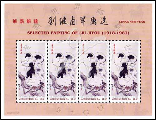 羊年生肖,刘继卣(1918-1983)“三羊图”小版张(4票)