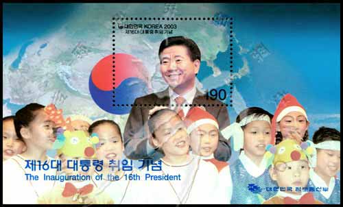 卢武铉就任韩国第16任总统,肖像、地图及儿童小型张
