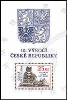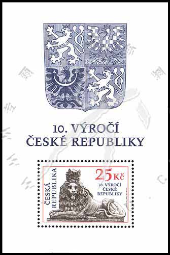 捷克共和国成立10周年,国徽、雕塑家Tosef Max1852年的作品双尾狮王小型张