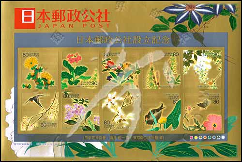 庆祝日本邮政公团改革系列一,酒井抱一绘制《四季花鸟图卷》不干胶小版张(11票)(我社已售缺)