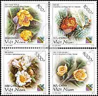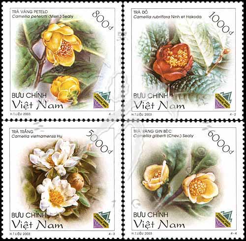 曼谷2003世界邮展—茶花,Rubriflora Ninhet Hakoda、多瓣金花茶(800d)、油茶(5000d)及短蕊茶(6000d)4全