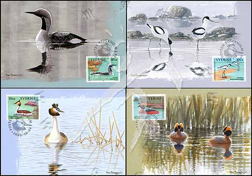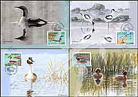 香港与瑞典联合发行湿地水鸟,反咀鹬、角鸊鷉、黑喉潜鸟和凤头鸊雕刻版摄影极限片4全(斯拉尼亚雕刻)