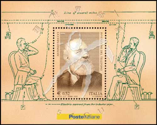 电话发明人安东尼奥.梅乌奇,肖像、话筒、试验场景、电线等小型张