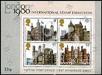 伦敦1980年国际邮展—古代建筑,伦敦塔、修道院与宫殿、卡那封城堡及辛普敦宫殿小全张(4票,英国首枚小全张)
