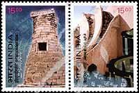印度与韩国建交30周年,韩国庆州的瞻星台及印斋埔尔市疆塔尔-曼塔尔天文台2联(与韩国联合发行)