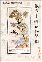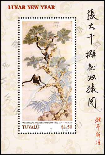 猴年生肖,张大千(1899-1983)水墨画《槲树双猿图》小型张