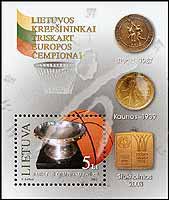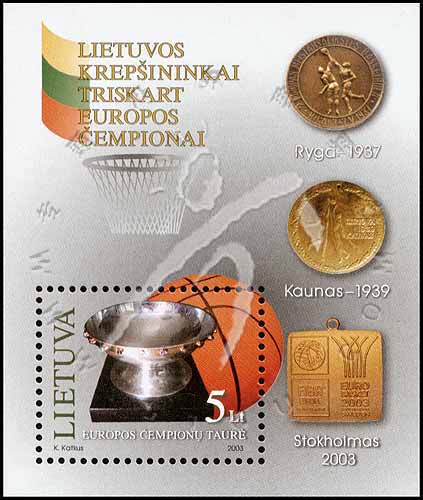 立陶宛男子篮球队三获欧洲冠军,国旗、奖杯及三连冠金牌(1937年瑞嘉、1939年考纳斯及2003年斯德哥尔摩)小型张