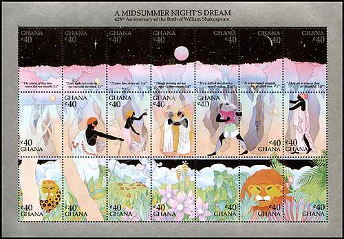 英国著名戏剧家和诗人莎士比亚诞生425周年,喜剧《仲夏夜之梦》小版张(21票)
