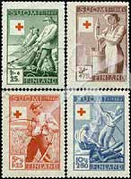 捕鱼、搅奶、割草、运原木红十字附捐票雕刻版4全