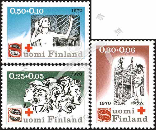 画家A·加伦·卡莱拉为A·基维《七兄弟》绘插图《在拉普摩石上》、《尤哈尼在埃姆皮瓦拉石上吹号》及《脸色苍白的少女》红十字附捐票3全