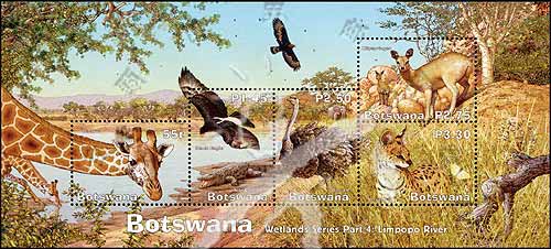 湿地系列四,林波波河湿地动物,长颈鹿、黑鹰、尼罗鳄、鸵鸟、山羚及薮猫小版张(5票)(我社已售缺)