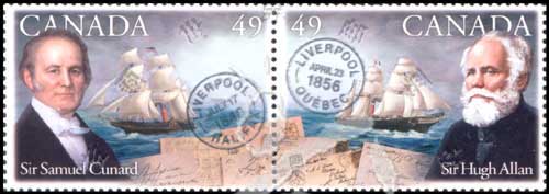 跨大西洋邮政服务的先驱—桑谬·柯纳爵士和休·阿伦爵士、肖像、帆船、信封及邮戳等不干胶自贴票2联